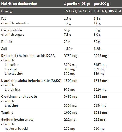 REANIMATOR obsahuje všetky základné zložky pre regeneráciu a rozvoj svalov, dodávané vo formách, ktoré sú najužitočnejšie a ľahko dostupné pre svalové tkanivo. Produkt je založený na látkach, ktoré pôsobia synchrónne a majú rôzny čas vstrebávania, aby sa zabezpečil neustály prístup k energetickým zlúčeninám, živinám a stavebným kameňom svalového tkaniva po tréningu. Okrem toho je produkt obohatený o kolagén, glukozamín sulfát a kyselinu hyalurónovú – makromolekuly, ktoré sú najcennejšie pre výživu, hydratáciu a obnovu pohybového aparátu a uľahčujú obnovu šliach, väzov a kĺbov poškodených v dôsledku dlhodobého a intenzívneho cvičenia.