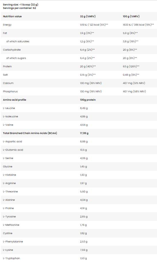 Srvátkový proteín FA obsahuje veľké množstvo bielkovín, aminokyselín s rozvetveným reťazcom ( BCAA ) a L-glutamín Toto sú najdôležitejšie zložky výživového doplnku vhodného pre všetkých športovcov. Pridané minerály – vápnik a fosfor – navyše podporujú normálnu funkciu svalov a metabolizmus. Srvátkový proteín obsahuje tiež tráviace enzýmy, ktoré majú priaznivý vplyv na neurotransmitery v tele a podieľajú sa na procese delenia buniek.