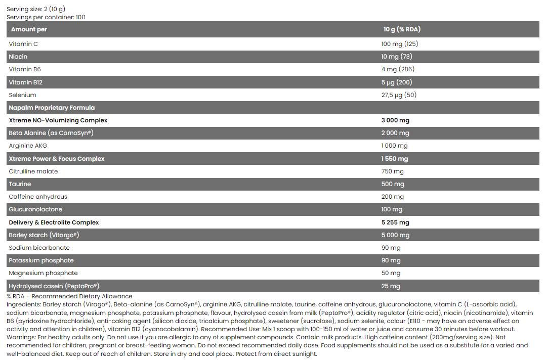 FA Nutrition Xtreme NAPALM Nabitý VITARGO® používa kombináciu synergických receptúr - Xtreme NO-Volumizing Complex, Xtreme Power & Focus Complex a Electrolite & Delivery Complex . Všetky tieto zložky spoločne zlepšujú napumpovanie, sústredenie a hydratáciu počas intenzívnej svalovej námahy. To umožňuje dlhšie a tvrdšie tréningy!
